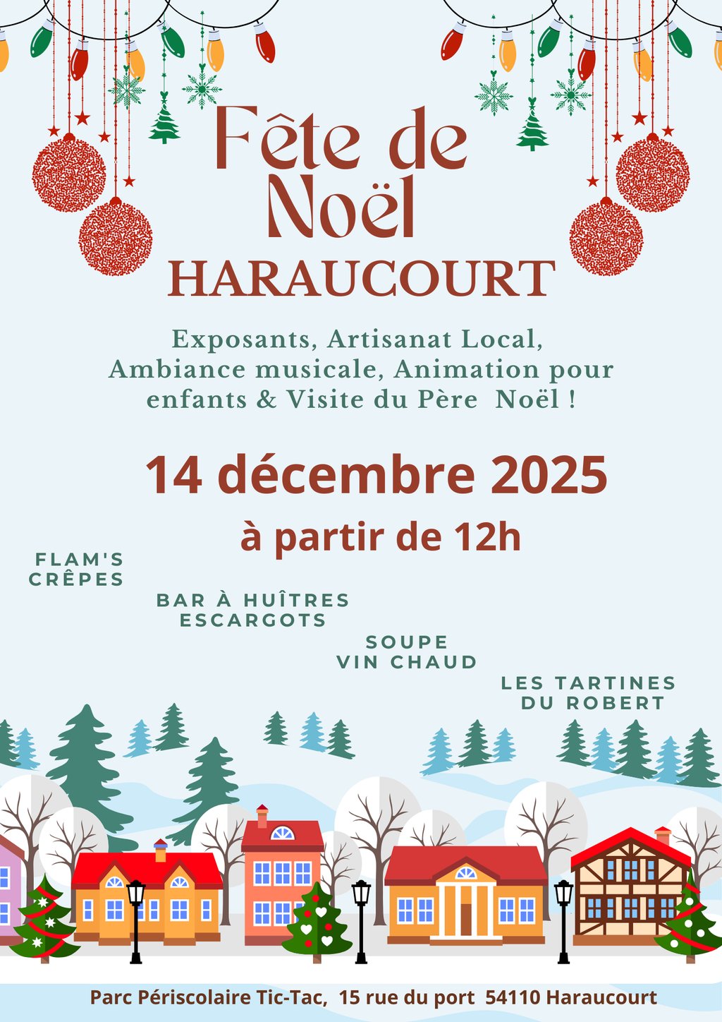 Cette année, le Marché de Noël sera présent le Dimanche 14 Décembre 2025 à partir de 12h00 au Parc Périscolaire TIC TAC - 15 rue du Port à HARAUCOURT.