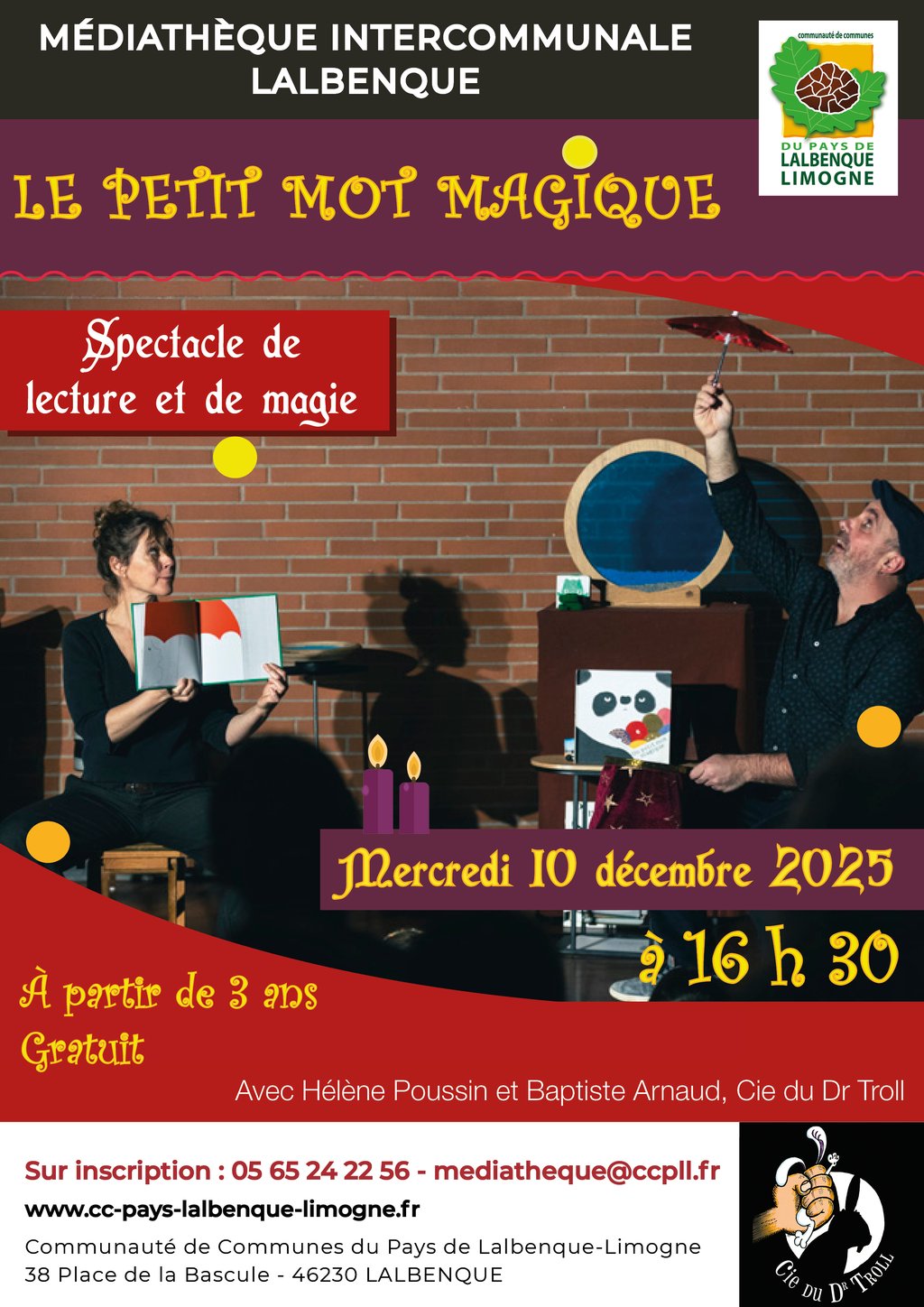 Le Petit Mot Magique : spectacle de lecture et de magie, vous donne rendez-vous le mercredi 10 décembre 2025, à 16 h 30, à la Médiathèque Intercommunale de Lalbenque.