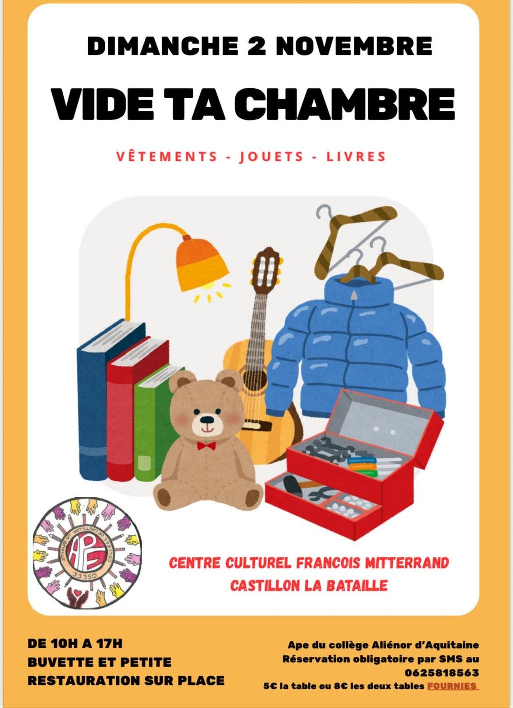 L'APE du college de Castillon organise son premier vide ta chambre, le dimanche 02 novembre au centre culturel de castillon.