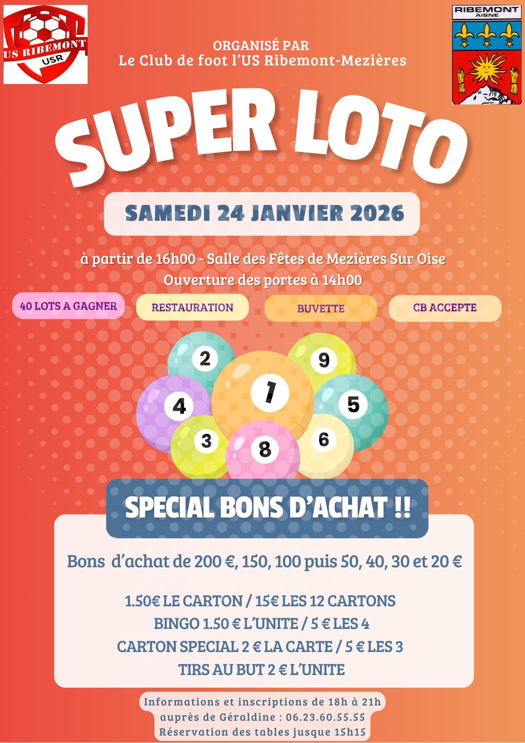Le Club de foot US Ribemont-Mézières organise son loto le 24 janvier prochain, ouverture des portes à compter de 14h00, début des jeux à 16h00.
