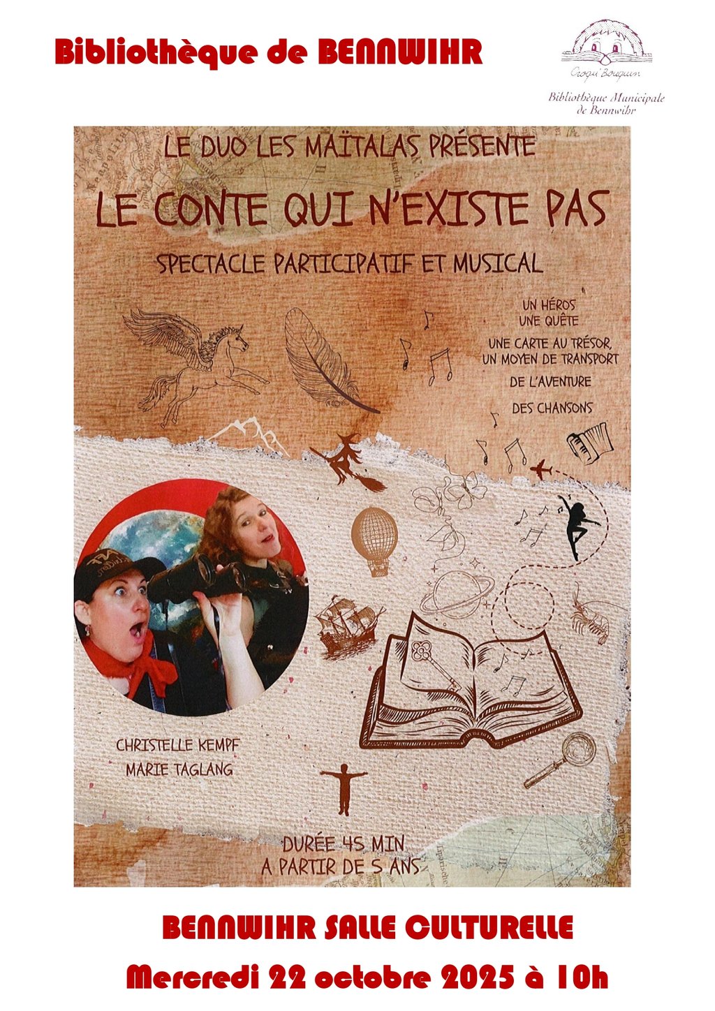 Ce spectacle aura lieu le Mercredi 22 octobre 2025 à 10h, dans la salle culturelle de BENNWIHR, Place de la Mairie