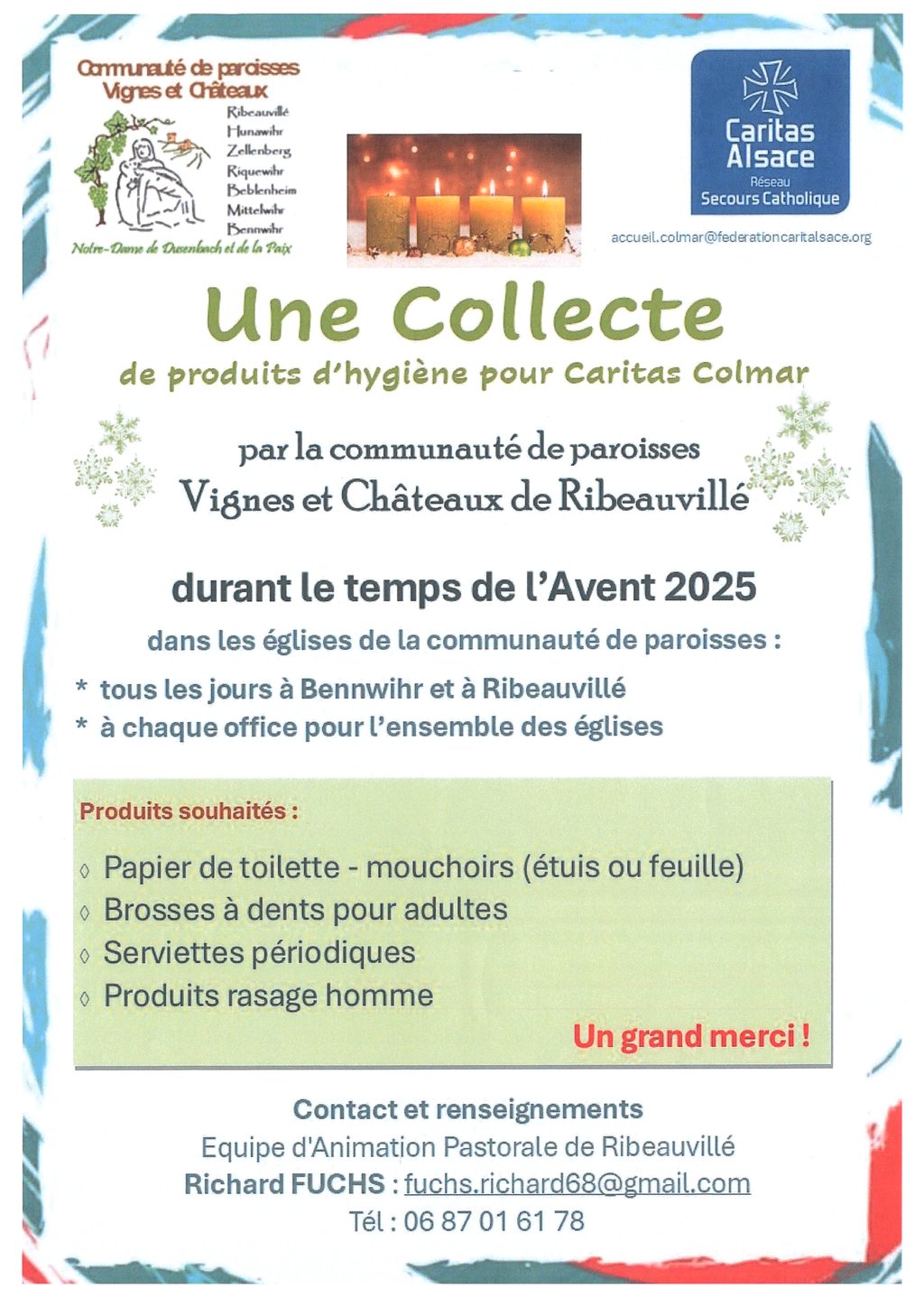 Durant le temps de l'Avent 2025, la communauté de paroisses Vignes et Châteaux de Ribeauvillé, organise une collecte de produits d'hygiène pour Caritas Colmar.