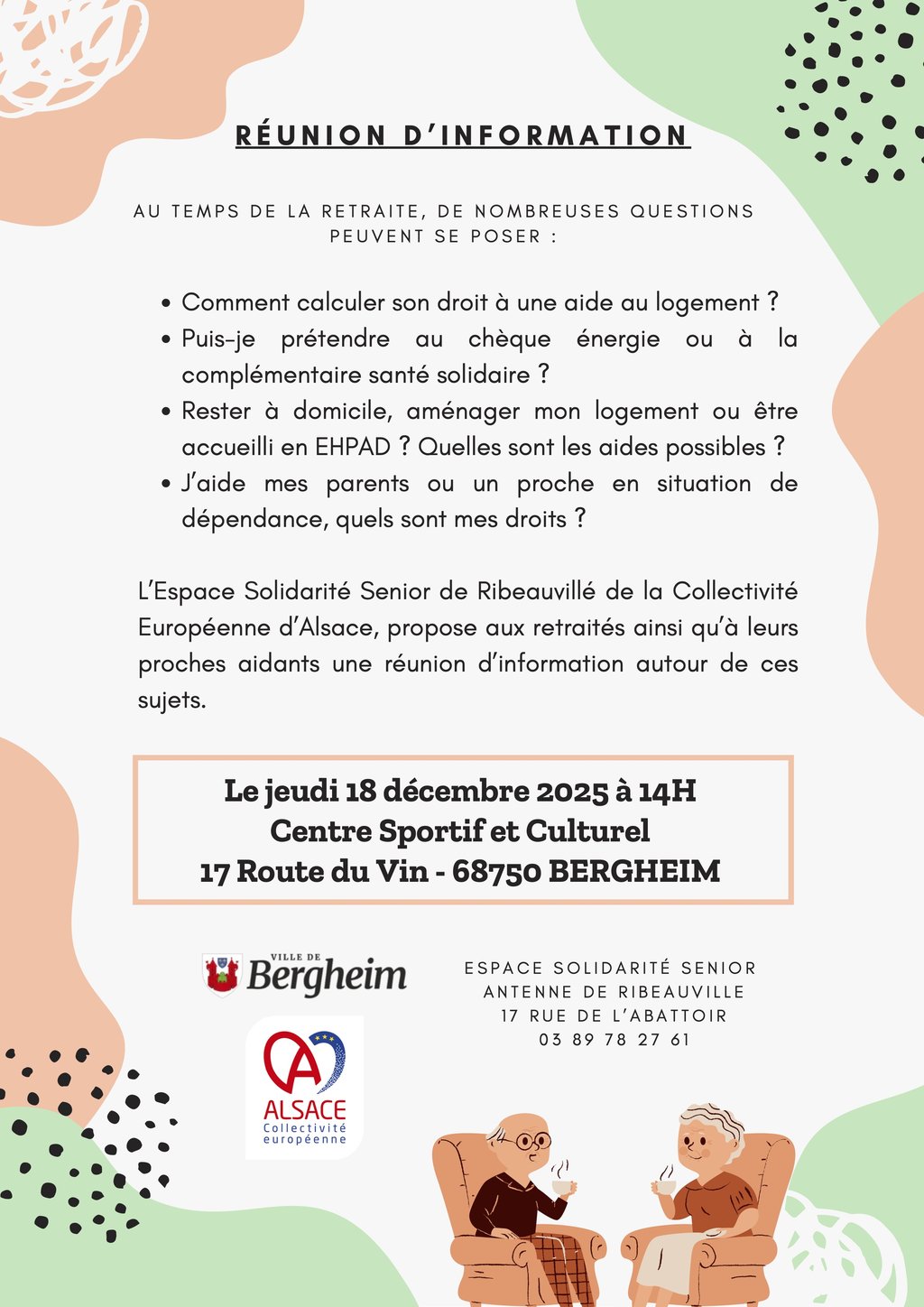 Cette initiative proposée par l’équipe sénior de l’Espace Solidarité Alsace de Ribeauvillé, vise à informer les personnes retraitées sur les dispositifs existants, les aides proposées par le service social, tant au niveau de difficultés d’autonomie (promouvoir le maintien à domicile) que de précarité (s’assurer que tous les droits sont ouverts). Les aidants familiaux, souvent concernés par ces questions, sont également les bienvenus à cette rencontre, afin de leur permettre d’échanger, de s’informer et de mieux accompagner leurs proches âgés.