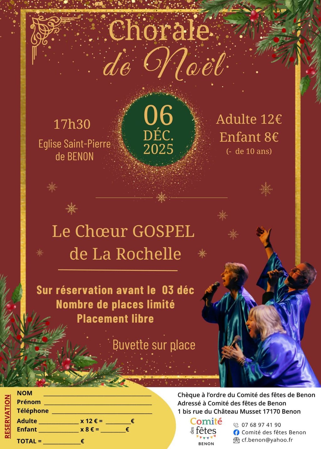 Le samedi 6 décembre 2025 à 17h30, l’église Saint-Pierre de Benon accueillera le Chœur Gospel de La Rochelle pour un concert exceptionnel placé sous le signe de la joie et du partage !