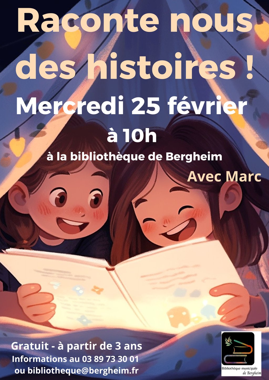 Pour les enfants à partir de 3 ans, venez écouter les histoires que Marc racontera mercredi 25/02 à 10h à la Bibliothèque.