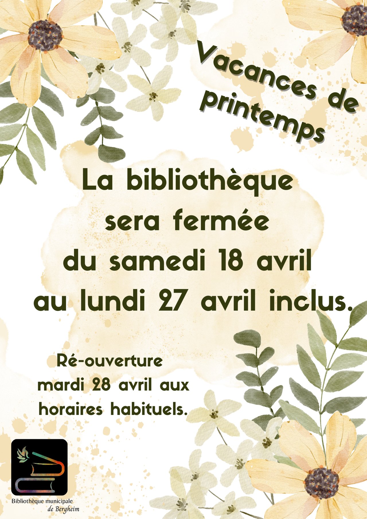 Fermeture pour congés de la bibliothèque du samedi 18 avril au lundi 27 avril inclus.