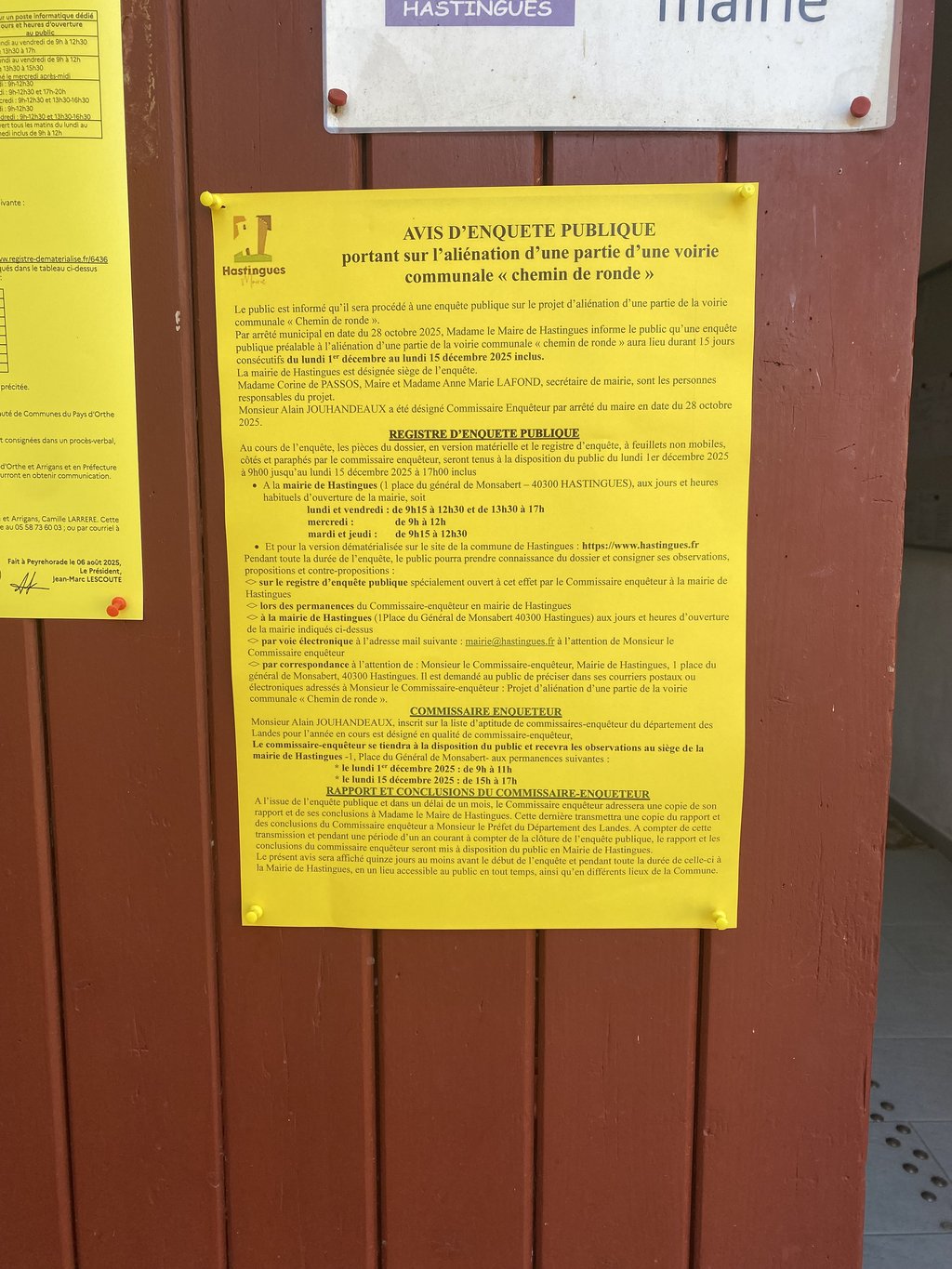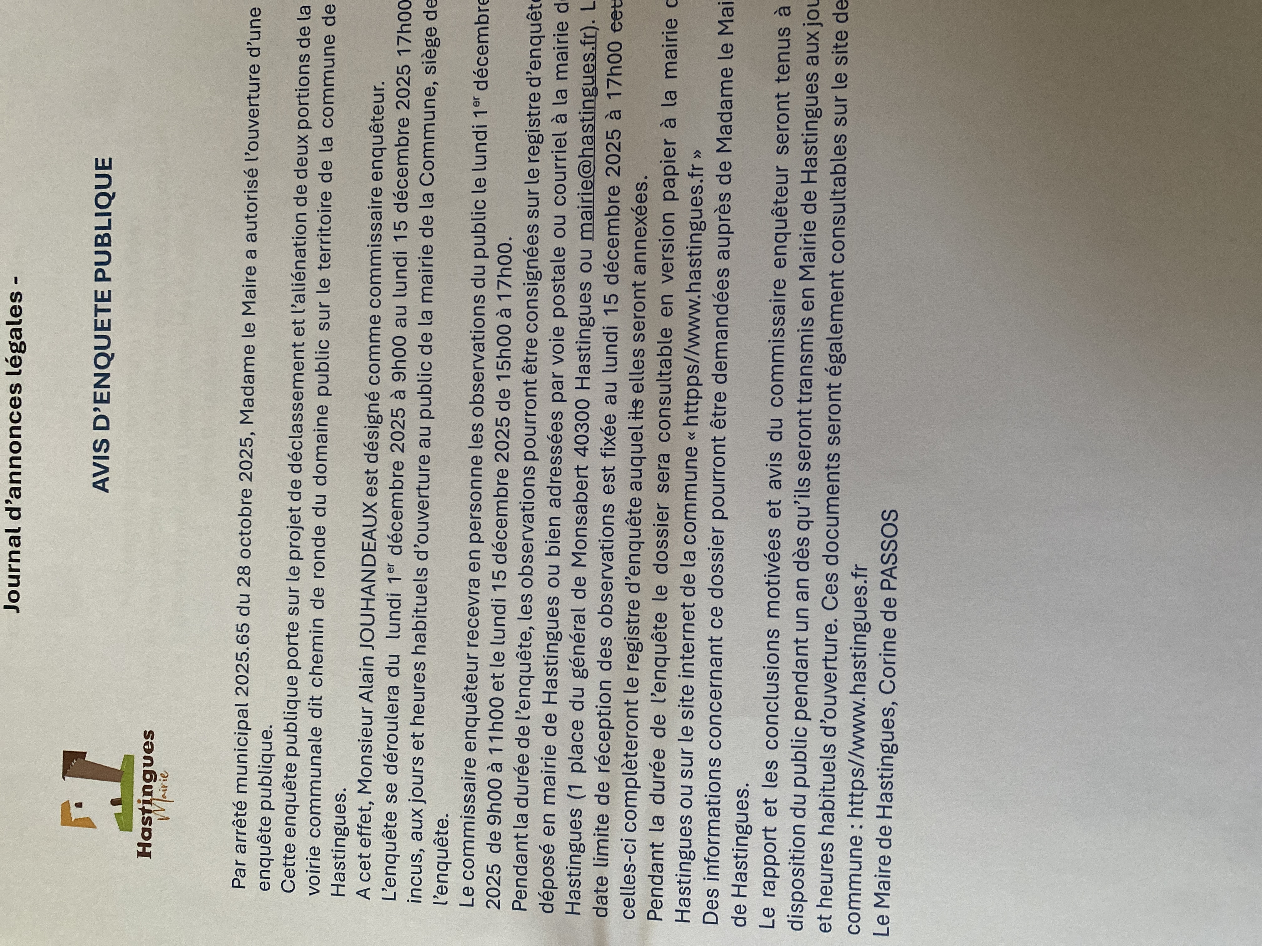 La commune de Hastingues lance une enquête publique pour un projet d'aliénation d'une portion de la voirie communale <chemin de ronde>
