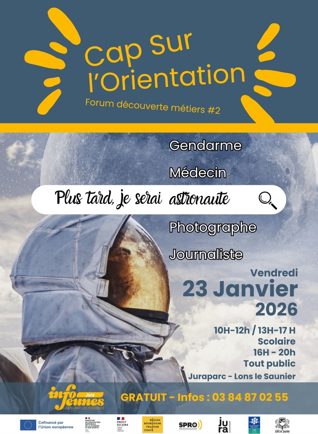 - Cap sur l'orientation, forum découverte des métiers qui se déroulera à Juraparc, le vendredi 23 janvier 2026 de 16h à 20h.