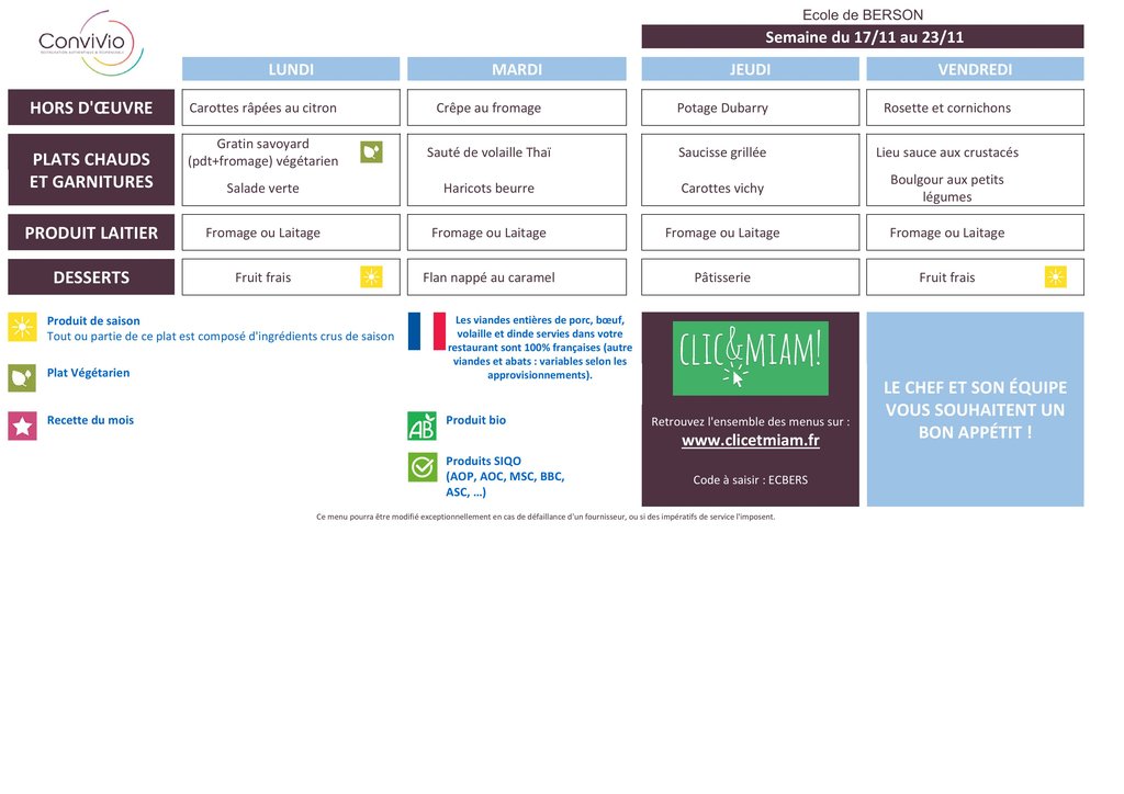 Menu du restaurant scolaire de l'école de Berson du lundi 17 au vendredi 21 novembre 2025