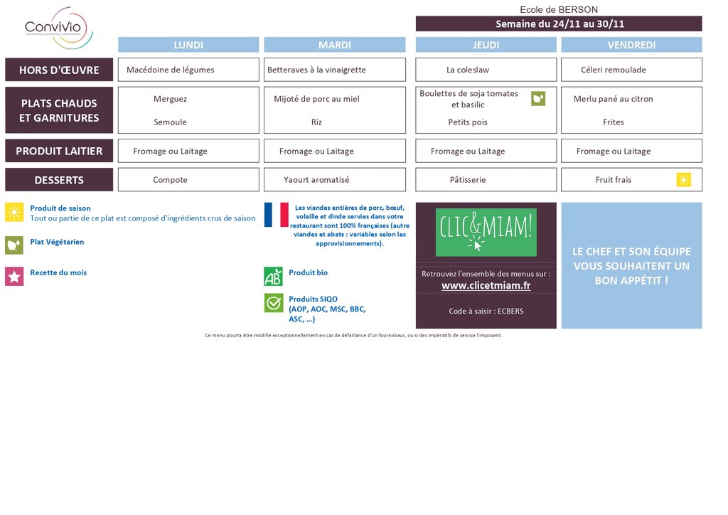 Menu du restaurant scolaire de l'école de Berson du lundi 24 au vendredi 30 novembre 2025