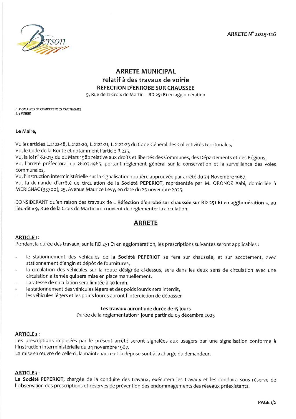 Des travaux de réfection d’enrobé sur chaussée, au lieu-dit « Rue de la Croix de Martin » débuteront le 5 décembre.