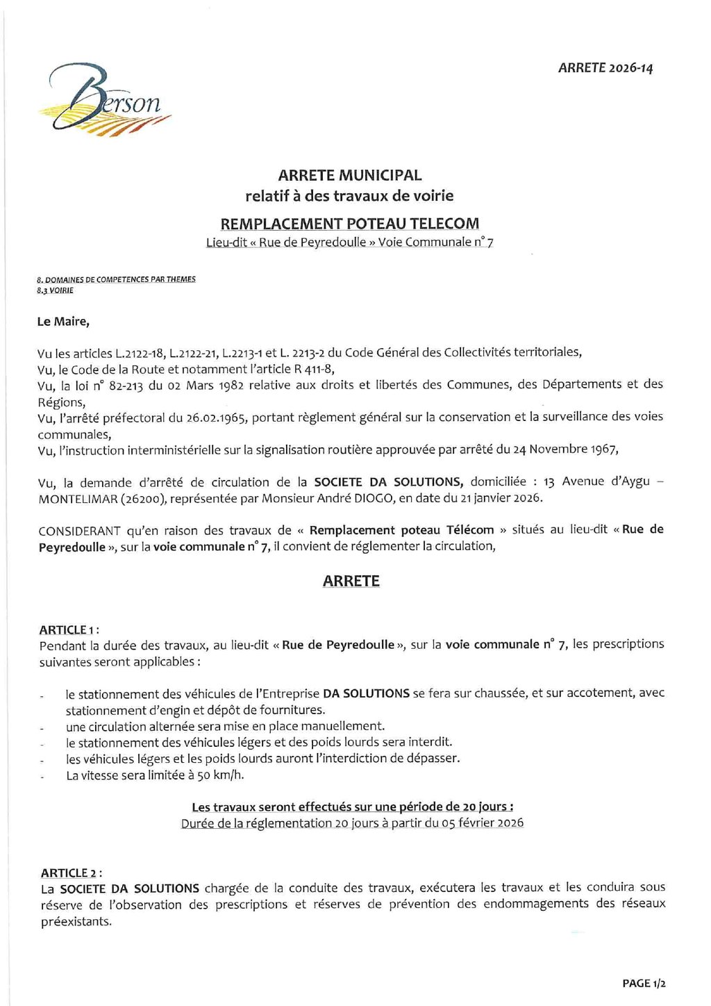 Des travaux de remplacement de poteau Telecom, au lieu-dit « Rue de Peyredoulle », voie communale n°7 seront effectués à compter du 5 février, sur une période de 20 jours.