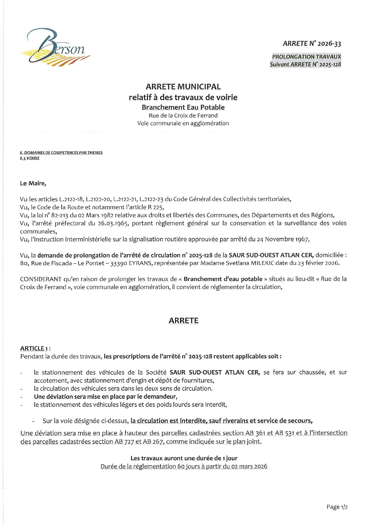 [INFORMATION] ⚠PROLONGATION TRAVAUX - BRANCHEMENT EAU POTABLE - ⚠ "LIEU-DIT RUE DE LA CROIX DE FERRAND"