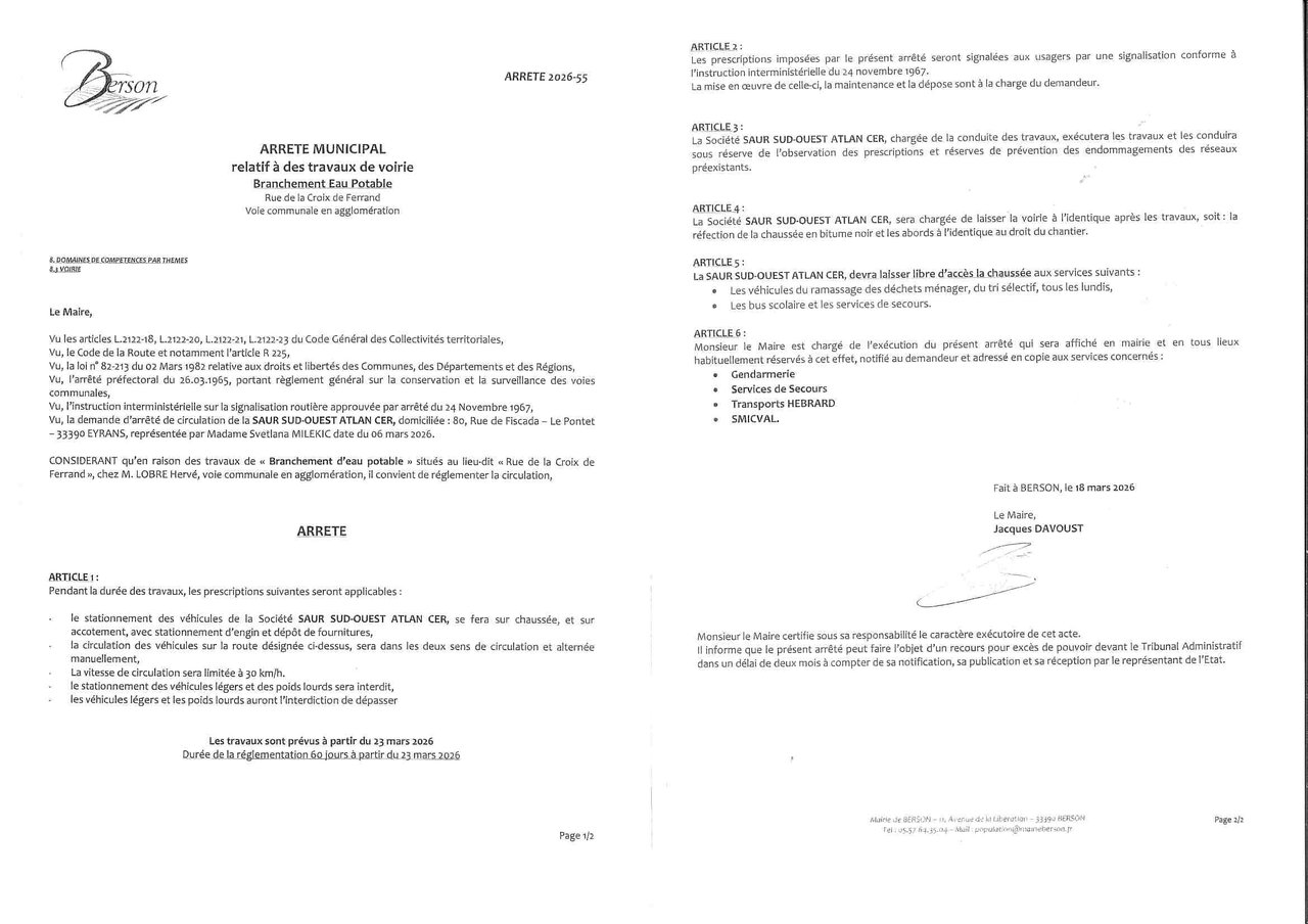 Des travaux de voirie "branchement d'eau potable ", "Rue de la Croix de Ferrand" sont prévus à partir du 23 mars 2026