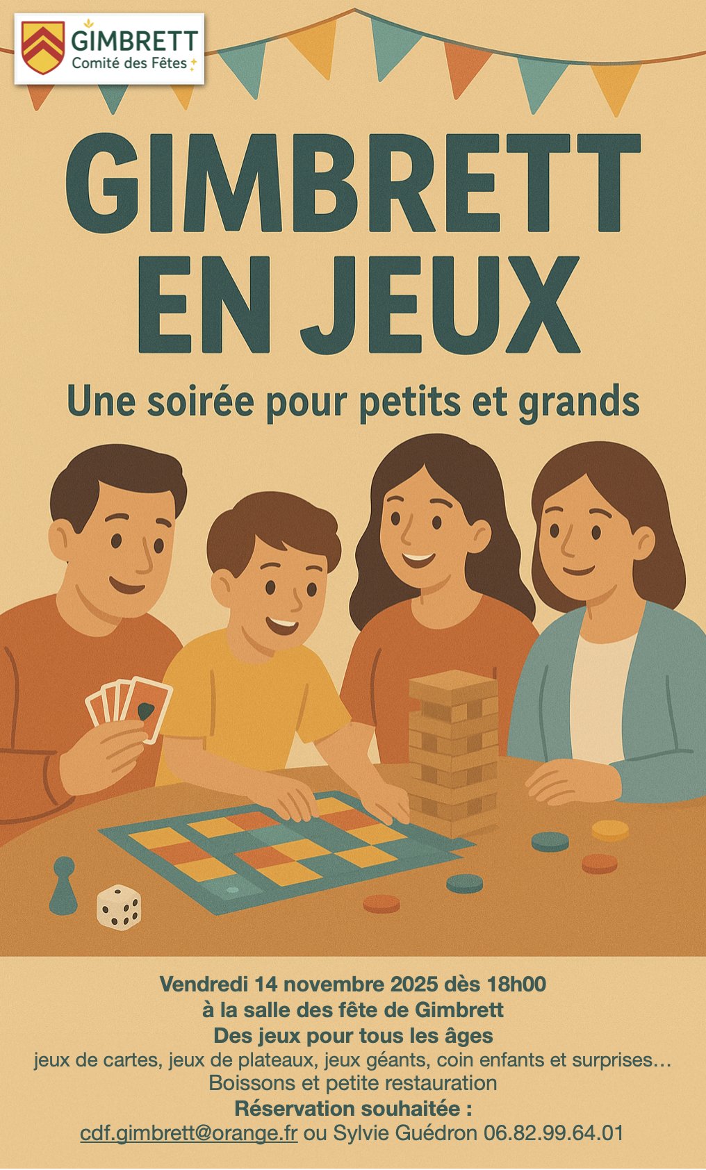 Le comité des fêtes de Gimbrett vous invite à une soirée jeux de société le vendredi 14 novembre 2025 à partir de 18h à la salle des fêtes de Gimbrett. Pour en savoir plus :