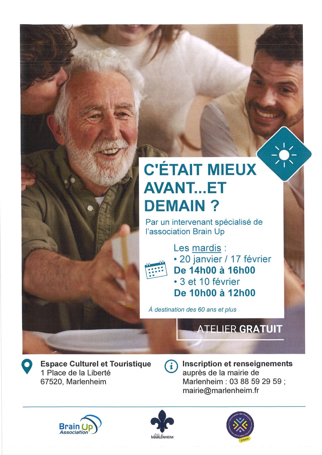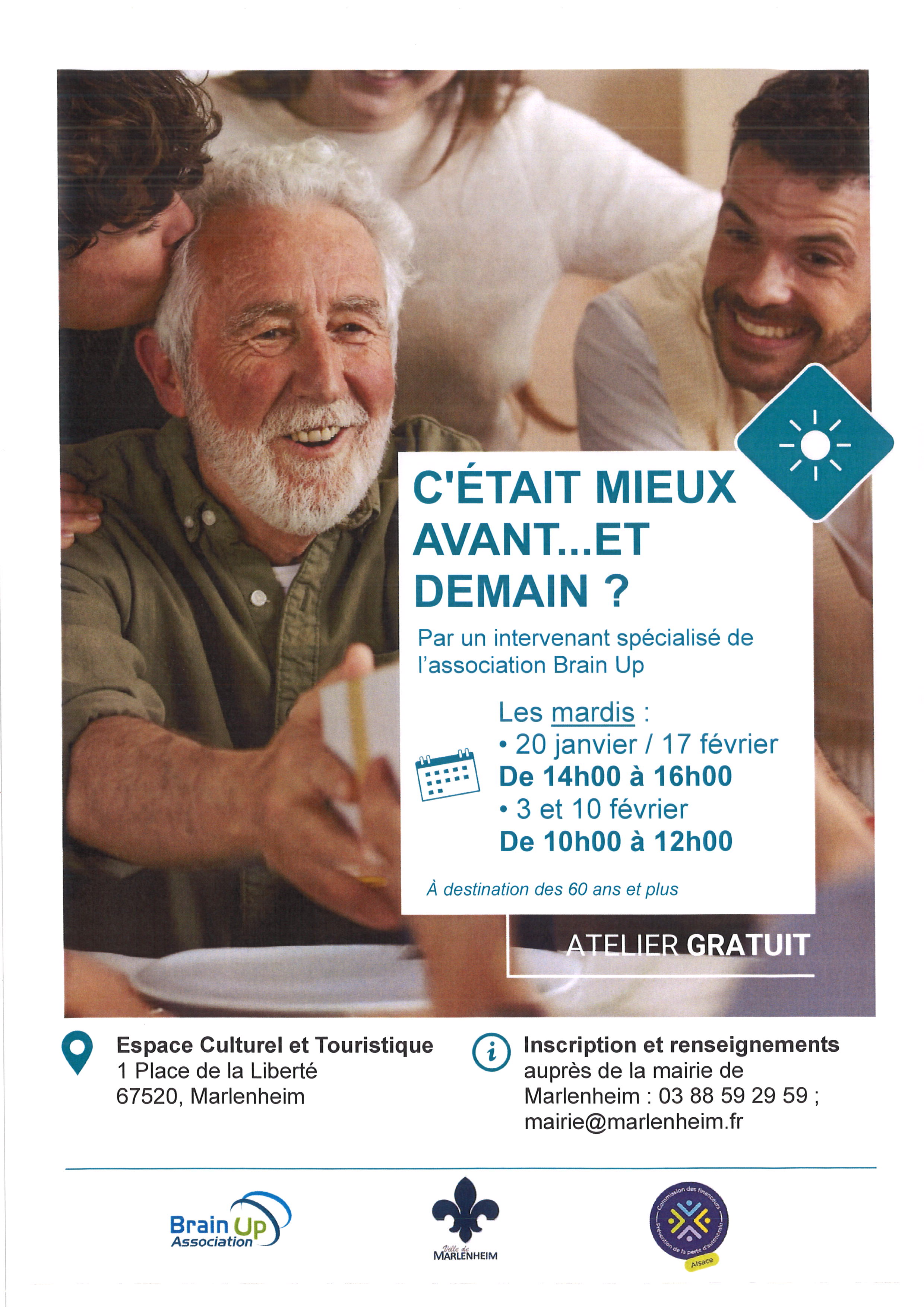C’est l’ambition de l’atelier « C’était mieux avant… Et demain ? », proposé par le CCAS de Marlenheim en partenariat avec l’association Brain Up. À travers 4 séances dynamiques et conviviales, ce programme invite les participants à revisiter leurs souvenirs, à découvrir ce qui rapproche ou distingue les générations, à apprivoiser leurs émotions face à l’incertitude, et à adopter des outils simples pour cultiver une vision positive de l’avenir.