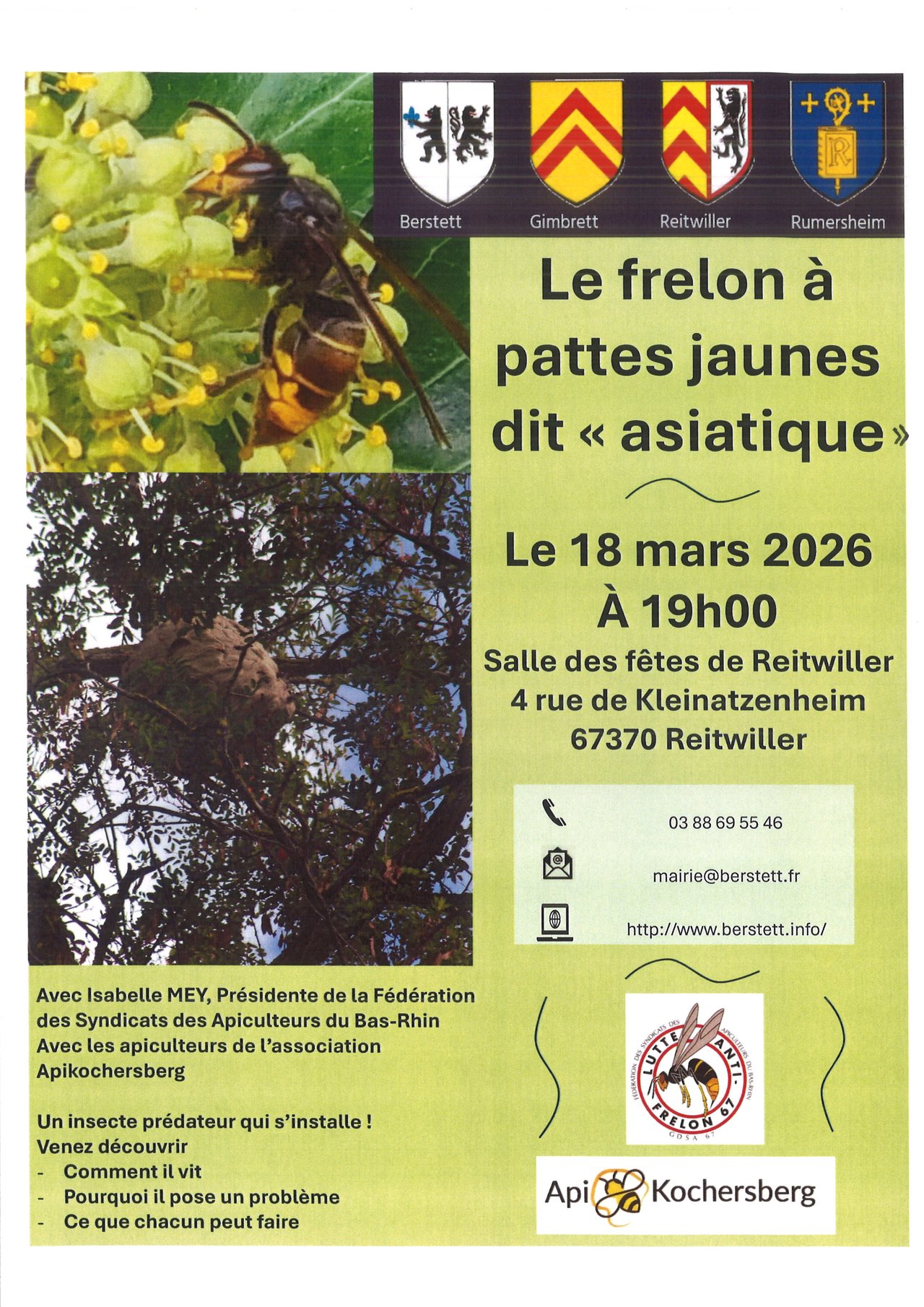 Venez assister à une réunion d'information sur le frelon asiatique le mercredi 18 mars à 19h à la salle des fêtes de Reitwiller, animé par Mme Isabelle MEY, présidente de la fédération des syndicats des apiculteurs du Bas-Rhin.