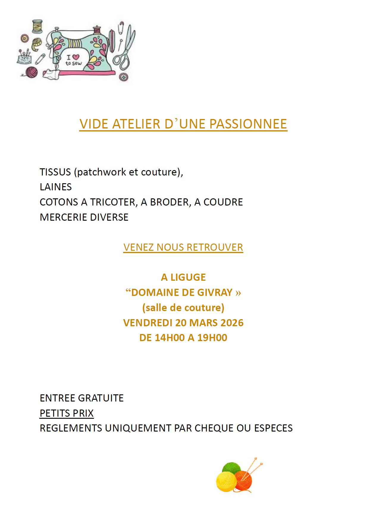Un vide atelier d'une des adhérentes de notre section Patchwork est organisé le 20 mars de 14h à 19h au domaine de Givray à Ligugé.