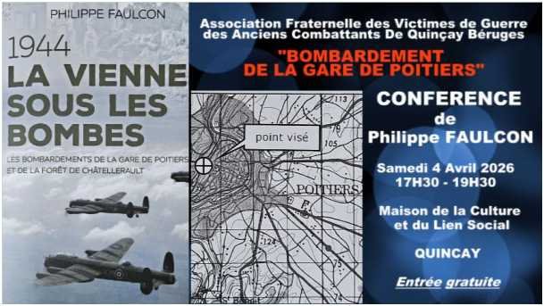 Philippe Faulcon, auteur du livre « 1944, la Vienne sous les Bombes » a travaillé 44 années dans le secteur aéronautique dont 19 dans l’armée de l’Air au sein d’unités et d’escadrons de transport. Passionné d’aviation, il s’est rapidement intéressé aux événements qui se sont déroulés dans la Vienne en 1944 et particulièrement le bombardement de la gare de Poitiers. Retraçant l’histoire des bombardiers quadrimoteurs Avro Lancaster et des bimoteurs De Havilland Mosquito, vous aurez au travers de son récit et des images projetées, l’impression d’être à bord de ces avions pour la préparation et le déroulement de leur mission. Chaque jour qui passe, une actualité chasse l’autre, il est important de prendre parfois le temps de s’arrêter et de se souvenir