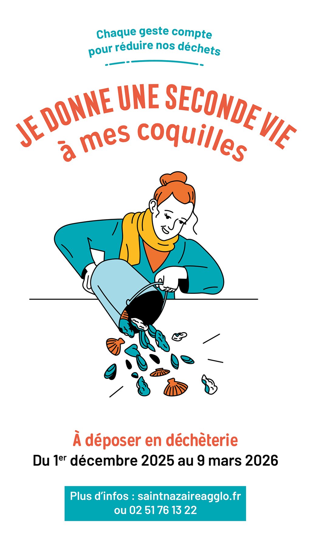 Du 1er décembre 2025 au 9 mars 2026, Saint-Nazaire Agglomération met à la disposition de ses habitant·es des points de dépôts des coquilles d’huitres et coquillages (coquilles Saint-Jacques, moules, praires, bulots, bigorneaux, palourdes…) dans les déchèteries suivantes :