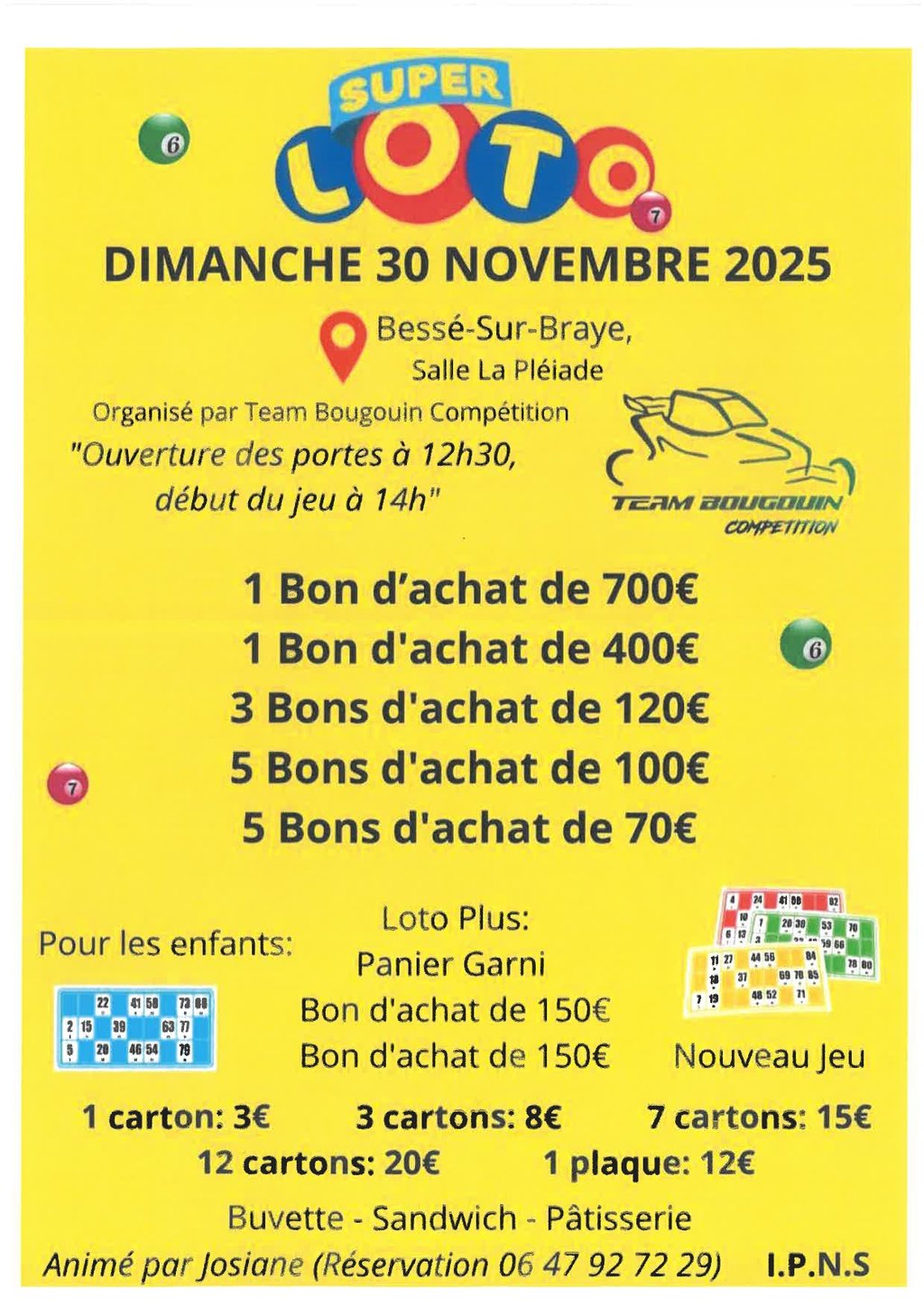 Loto organisé par Team Bougouin Comépétition le dimanche 30 novembre 2025 à la Pléiade. Ouverture des portes à 12 h 30.