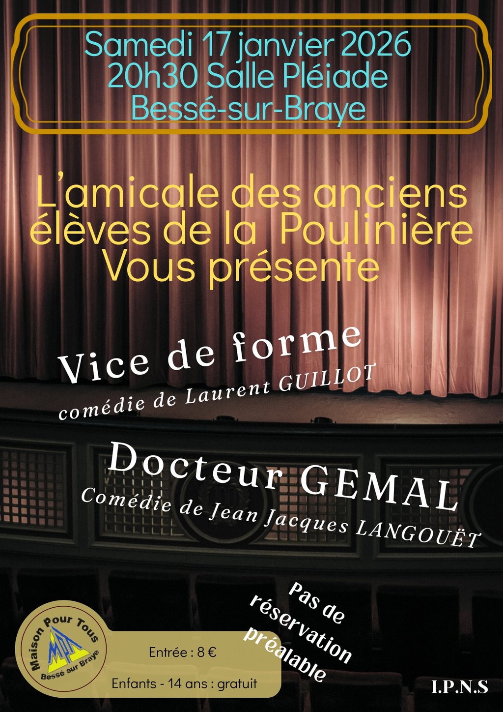 L'Amicale des Anciens Élèves de la Poulinière en collaboration avec la Maison Pour Tous propose le 17 janvier à la Pléiade une représentation théâtrale "Vice de forme" et "Docteur GEMAL".
