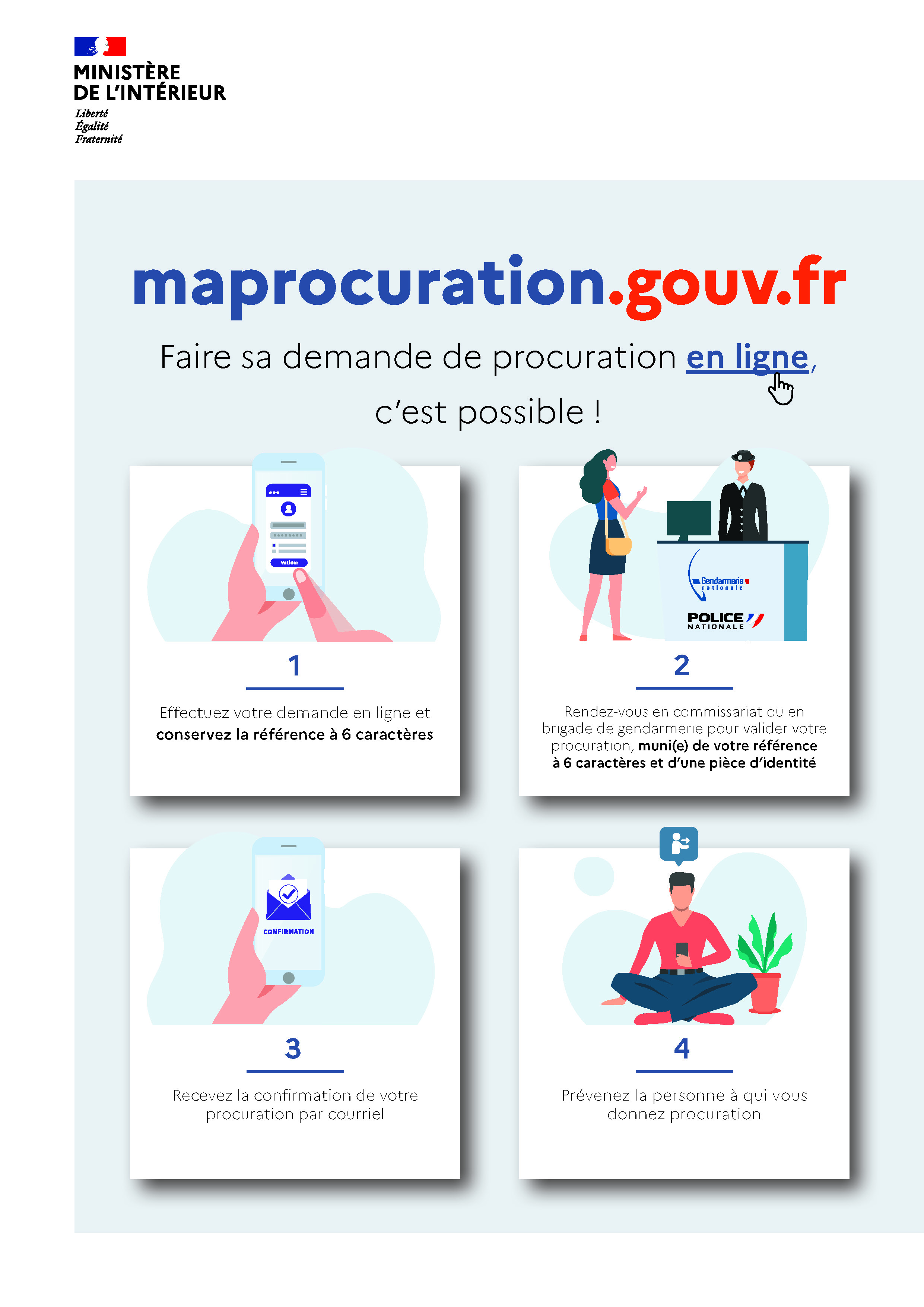 - en recourant à la procédure partiellement dématérialisée via le site « Maprocuration » : une fois le formulaire rempli en ligne, le mandant, muni d'un code, doit se rendre dans n'importe quel commissariat ou gendarmerie pour justifier de son identité (sauf s'il ne peut manifestement pas comparaître devant elles en raison de maladies ou d'infirmités graves, auquel cas ces autorités se déplacent);