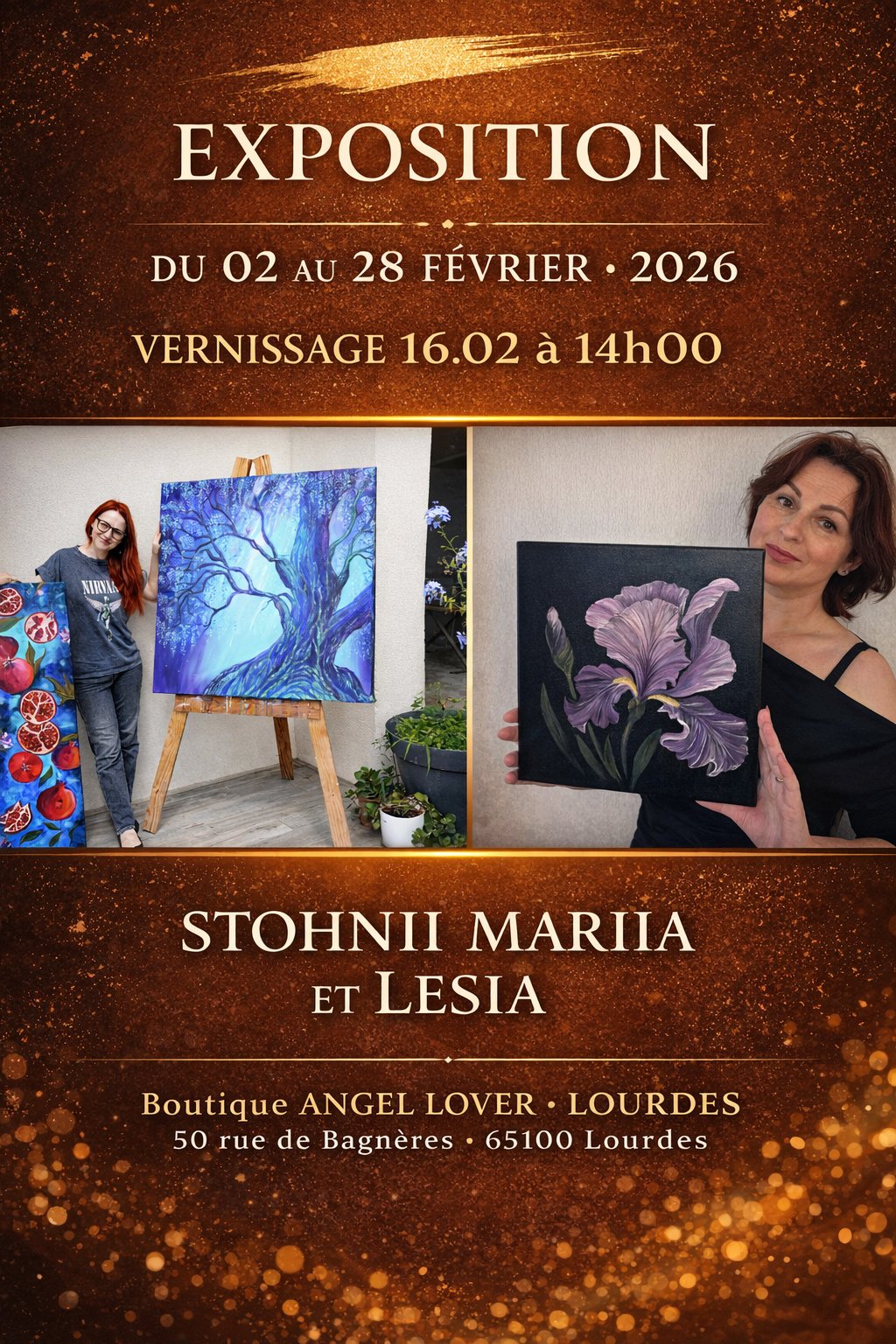"Artistes peintres d’origine ukrainienne, Mariia et Lesia Stohnii développent un univers artistique sensible et contemporain, inspiré par la nature, l’émotion et l’énergie du vivant. Leur travail, à la fois poétique et expressif, se distingue par une recherche approfondie de la couleur, du mouvement et de la matière, offrant au regard une véritable immersion sensorielle.