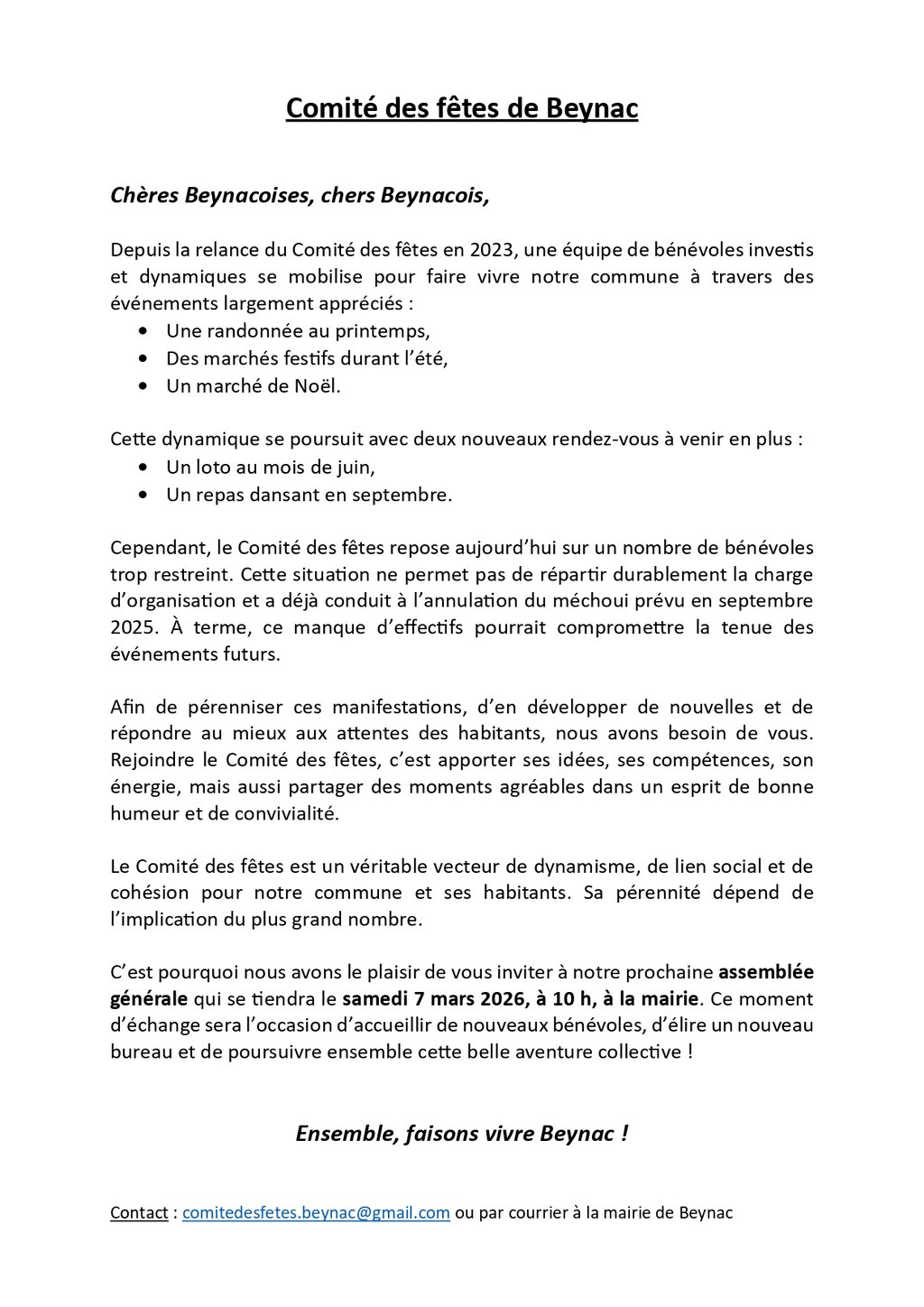 Samedi 7 mars, à 10 h, à la mairie, assemblée générale du Comité des fêtes de Beynac.