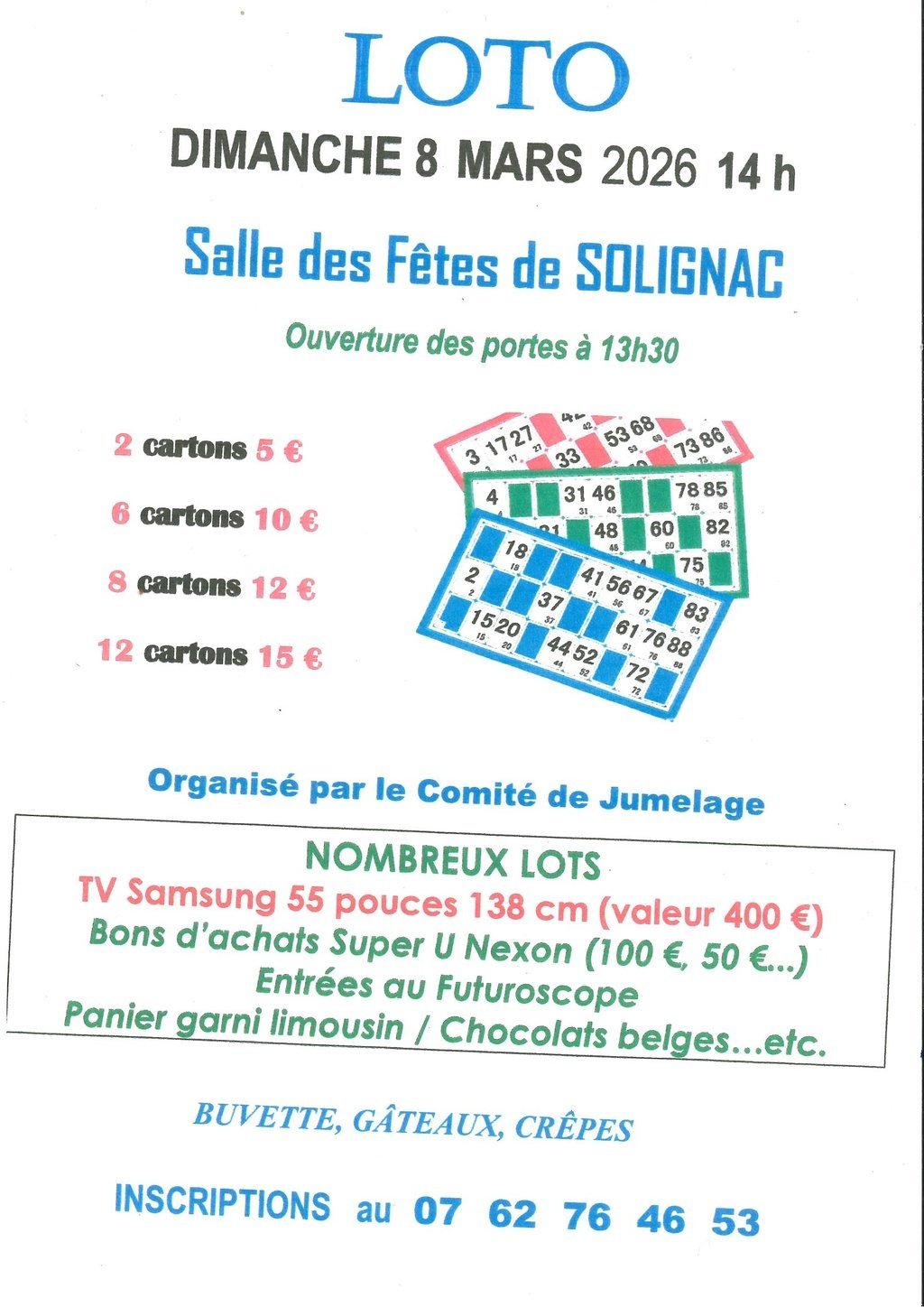 Le comité de jumelage organise un loto à la salle des fêtes de Solignac le dimanche 8 mars à partir de 14h00.