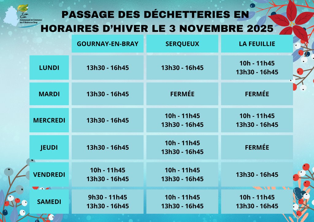 PASSAGE DES DECHETTERIES EN HORAIRE D'HIVER A PARTIR DU 3 NOVEMBRE 2025