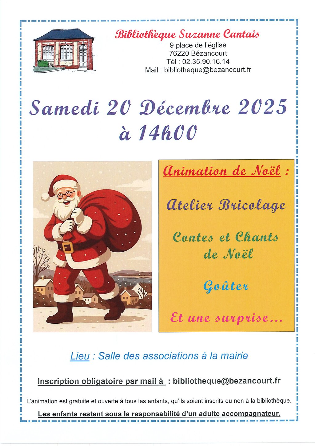 La bibliothèque vous propose une animation jeunesse samedi 20 décembre 2025 à 14h00 sur le thème de Noël.