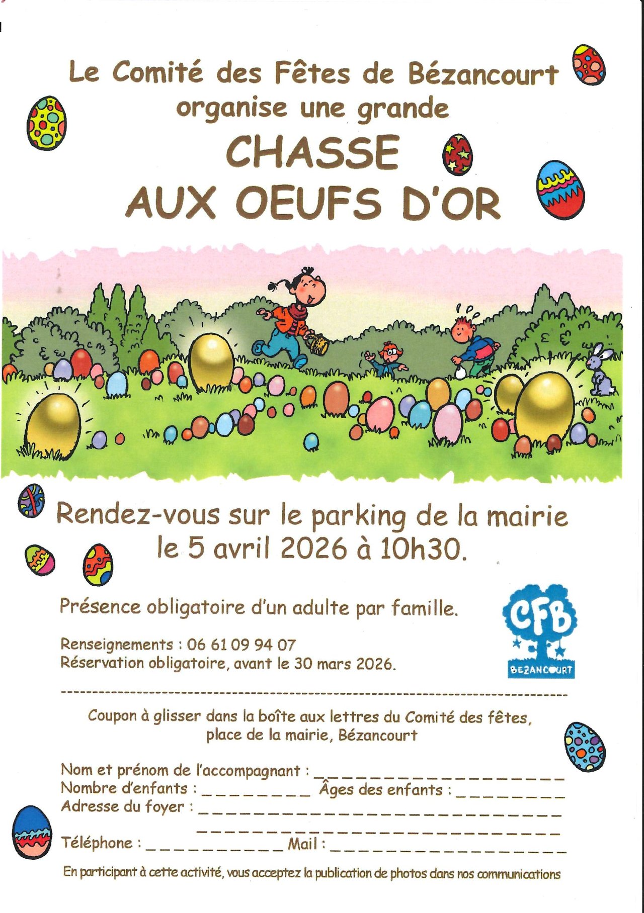 Le Comité des Fêtes de Bézancourt organise une GRANDE CHASSE AUX ŒUFS D'OR