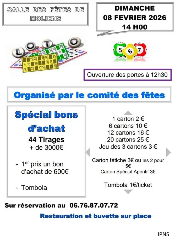 Le Comité des Fêtes de MOLIENS vous informe que leur prochain LOTO aura lieu le dimanche 08 février 2026 à 14h00...🤩