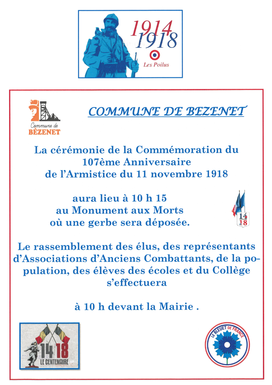 La cérémonie commémoration du 107ème anniversaire dd l'Armistice du 11 novembre 1918, aura lieu à 10H15 au Monument aux Morts ou une gerbe sera déposée.