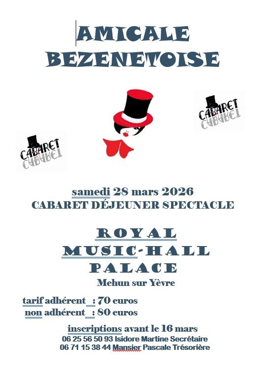 Un moment de gastronomie et de détente vous est proposé le samedi 28 mars avec la sortie cabaret au Royal Music Hall Palace à Mehun sur Yèvre (Cher), avec un déjeuner spectacle, cancan et humour, de plus de deux heures.