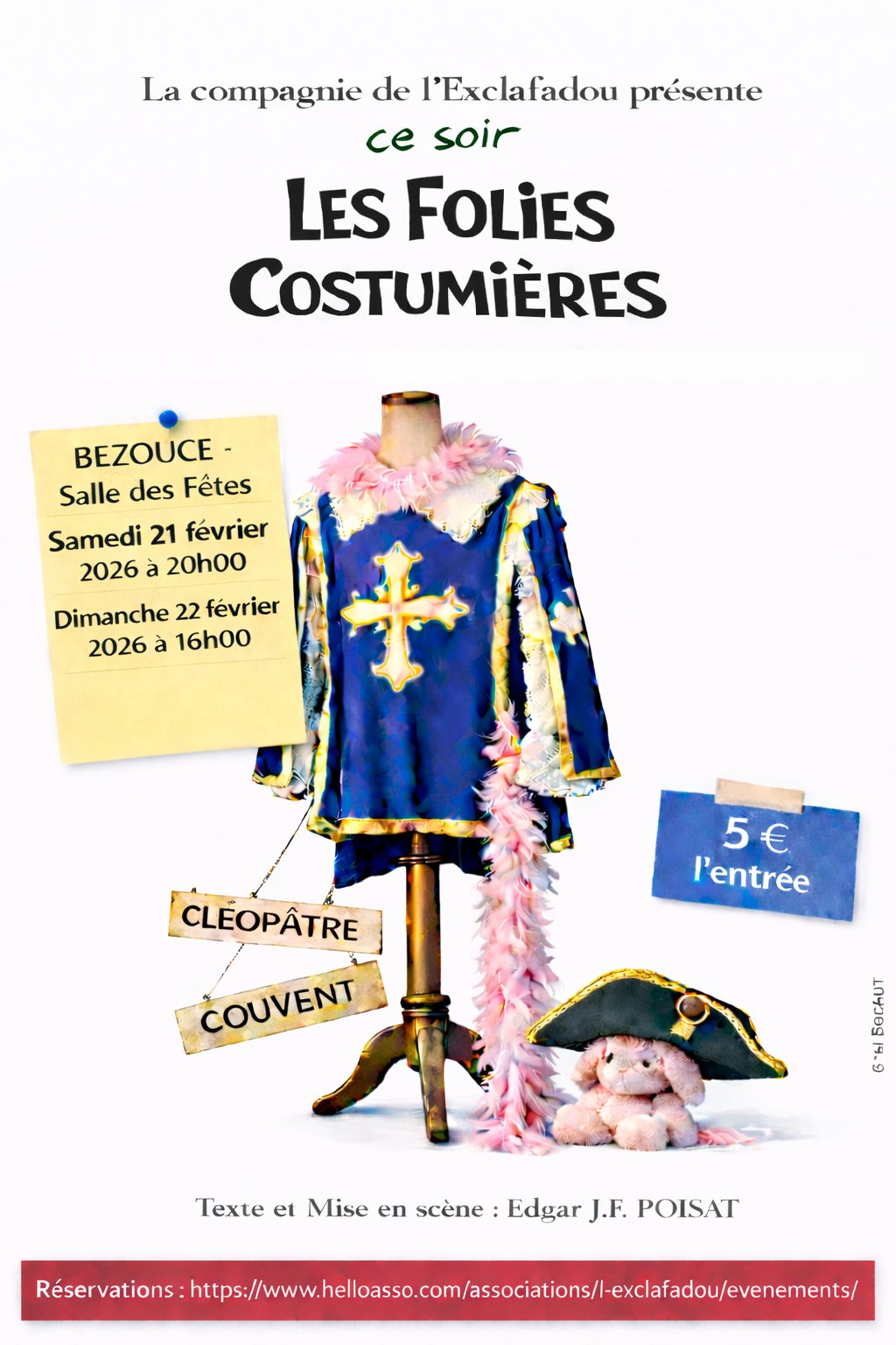 Les Folies Costumières nous entraîne dans l’effervescence d’une loge de théâtre, où une troupe se prépare à jouer une pièce historique. À une heure de la représentation, tout devrait être prêt, mais tout est en désordre. La loge se transforme rapidement en un véritable chaos, avec des quiproquos aussi rapides que les changements de costumes. Entre improvisations ratées et caprices des acteurs, Cléopâtre croise un lapin et le désastre devient un spectacle à part entière. Absurde, rythmée et joyeusement décalée, cette comédie dévoile un univers où l’art dramatique flirte avec le burlesque, offrant une explosion de rires😂