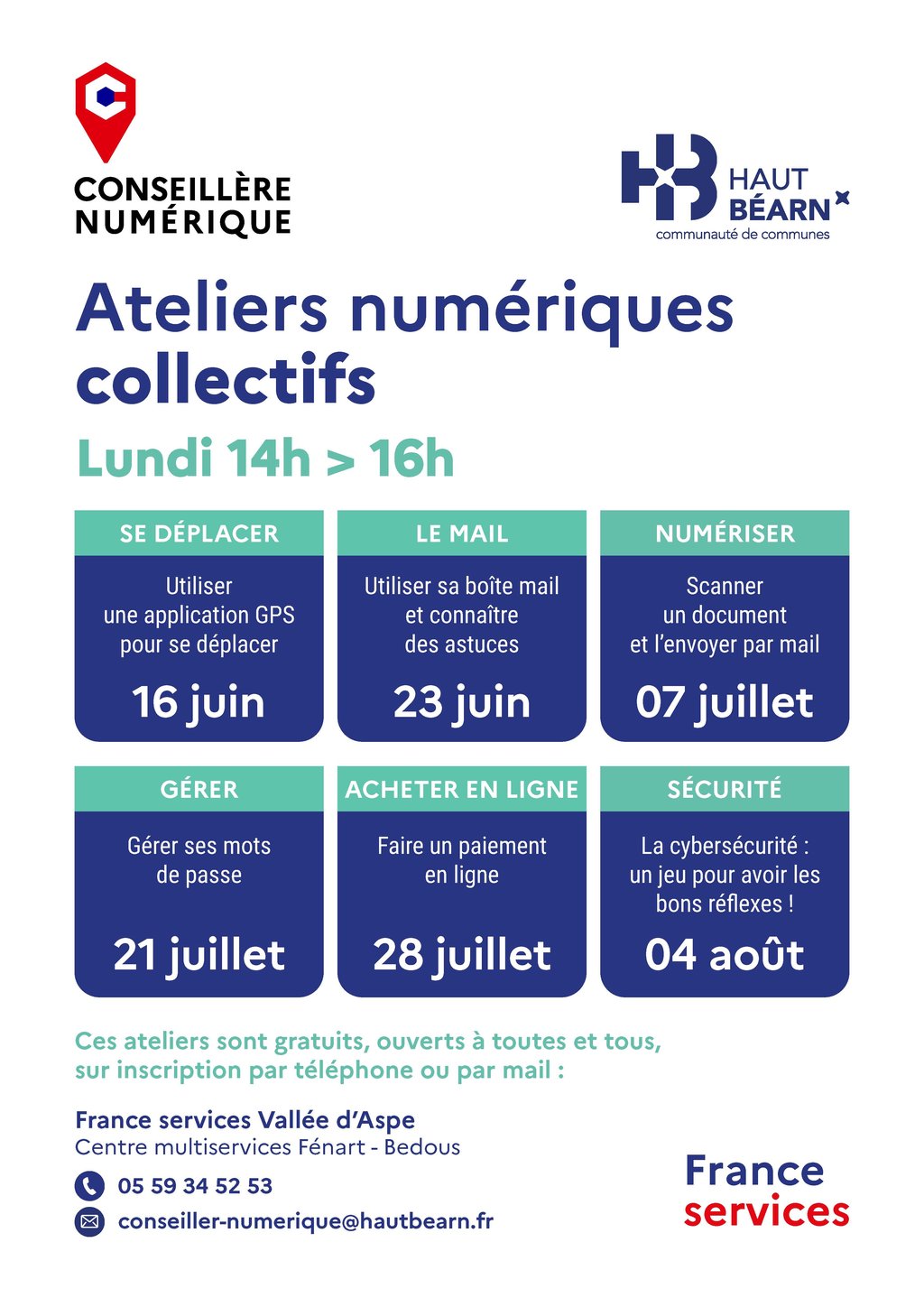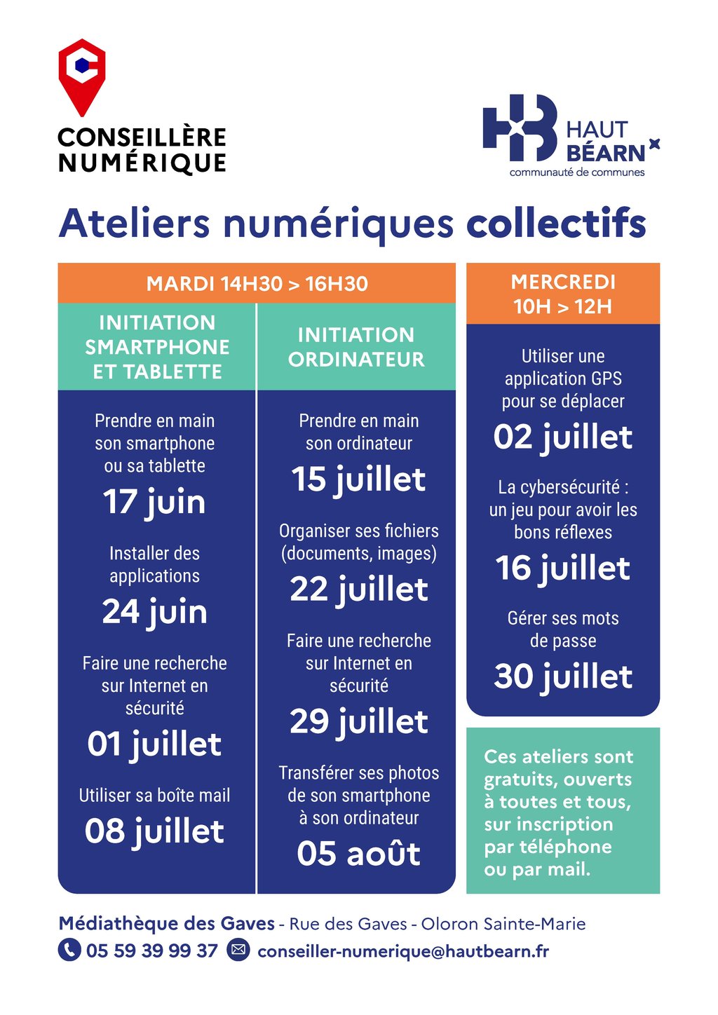 La CommunautĂ© de Communes du Haut-BĂ©arn propose des ateliers numĂ©riques collectifs thĂ©matiques, le lundi Ă France services VallĂ©e d'Aspe Ă Bedous et les mardis et mercredis Ă la MĂ©diathĂšque des Gaves d'Oloron Sainte-Marie.Â