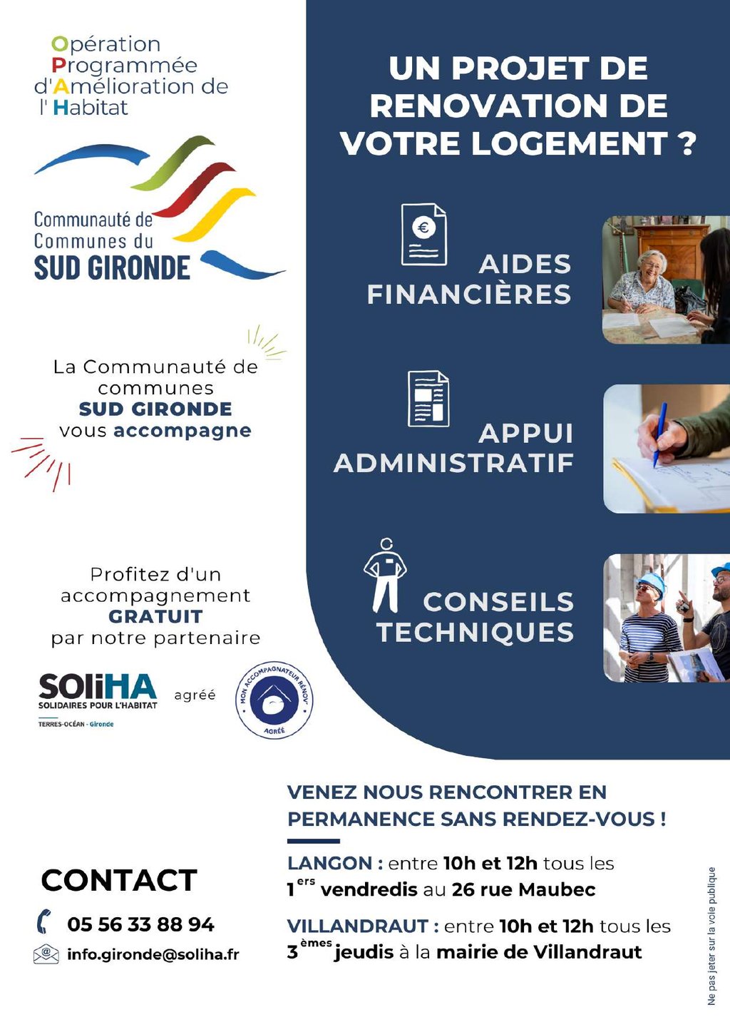 đ La permanence de Soliha vous accompagnant pour vos projets en lien avec l'OPAH (OpĂ©ration ProgrammĂ©e d'AmĂ©lioration de l'Habitat) a lieu deux fois par mois Ă Langon, et Ă Villandraut :