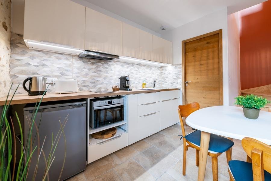 Cet hébergement touristique séduit par ses pierres apparentes et ses volumes généreux, agrémentés d'équipements contemporains : chauffage au sol pour un confort optimal toute l'année, connexion fibre haut débit parfaite pour le télétravail, et cuisine tout équipée.