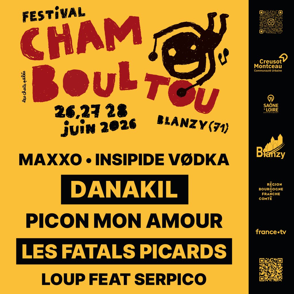 Du 26 au 28 juin 2026, vibrez au rythme du Festival Chamboultou ! Trois jours de musique, de rencontres et de bonne humeur à Blanzy, avec des têtes d’affiche comme Danakil, Les Fatals Picards et Picon Mon Amour, des aftershows endiablés, et une journée gratuite pour tous le dimanche.