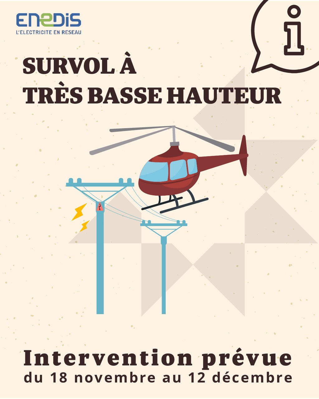 Dans le cadre de l’entretien de son réseau, Enedis effectuera un survol des lignes moyenne tension (20 000 volts) sur le territoire de la commune (hors agglomération) du 18 novembre au 12 décembre 2025.