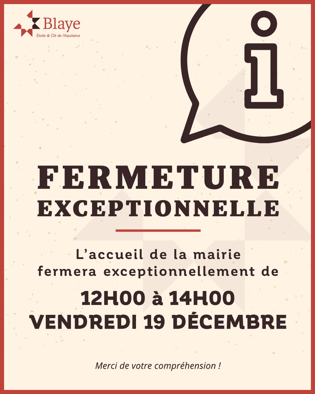 L'accueil de la Mairie fermera exceptionnellement de 12h00 à 14h00, vendredi 19 décembre.