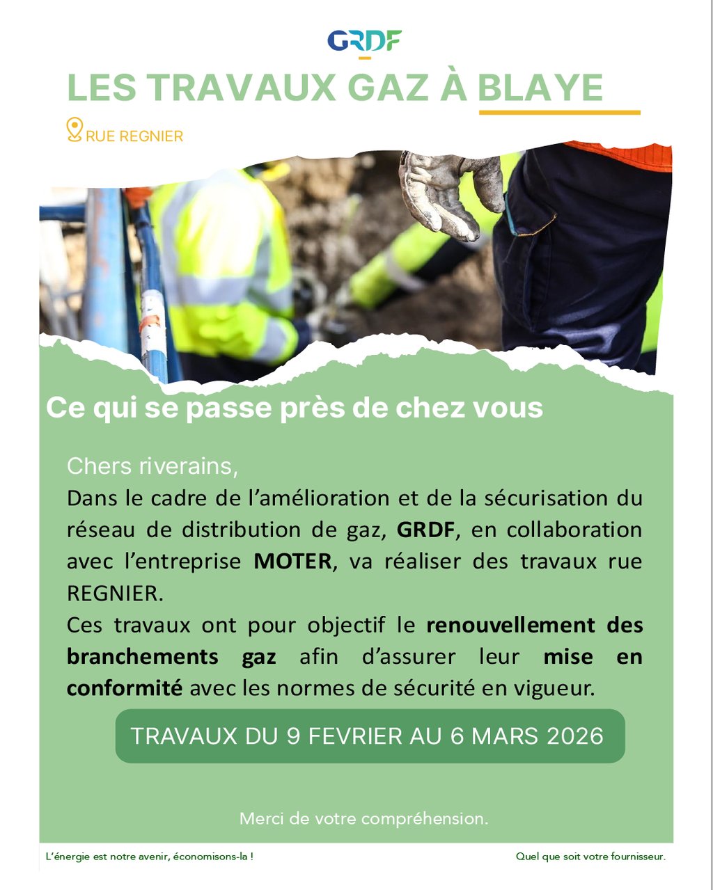 Dans le cadre de l'amélioration et de la sécurisation du réseau de distribution de gaz, GRDF, en collaboration avec l'entreprise MOTHER, va réaliser des travaux rue REGNIER.