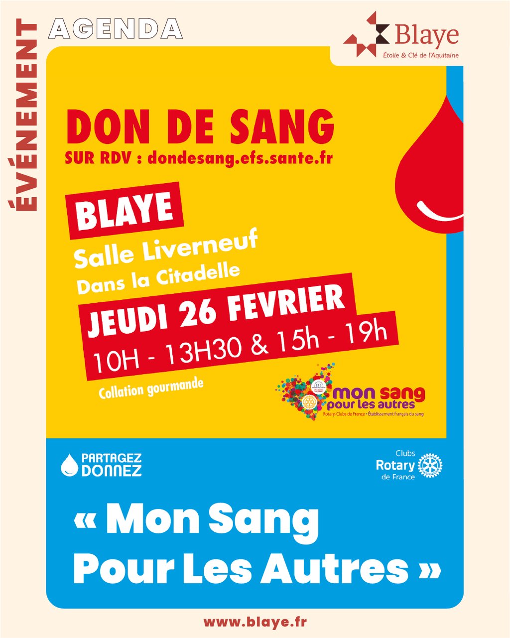 La collecte « Mon Sang Pour Les Autres », organisée en partenariat avec le Rotary Club de Blaye, revient à la salle Liverneuf à la Citadelle de Blaye le 26 février à 10h-13h30 & 15h-19h.