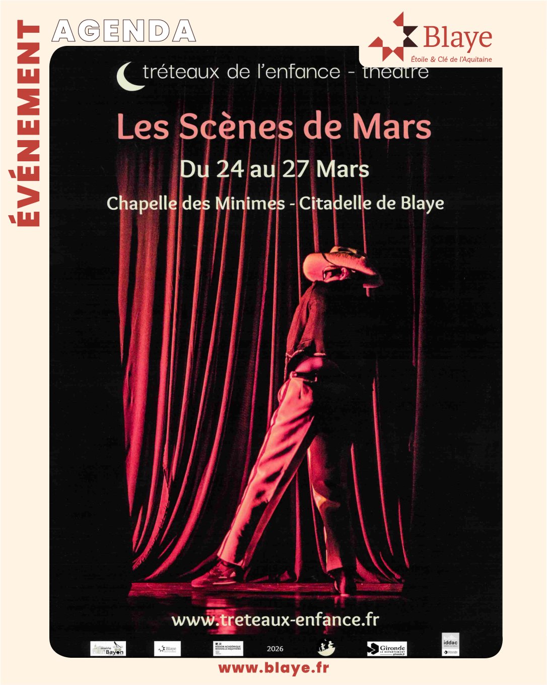 Du 24 au 27 mars, les Scènes de Mars reviennent à la Chapelle des Minimes – Citadelle de Blaye pour plusieurs jours de théâtre, de rencontres et de découvertes artistiques ✨