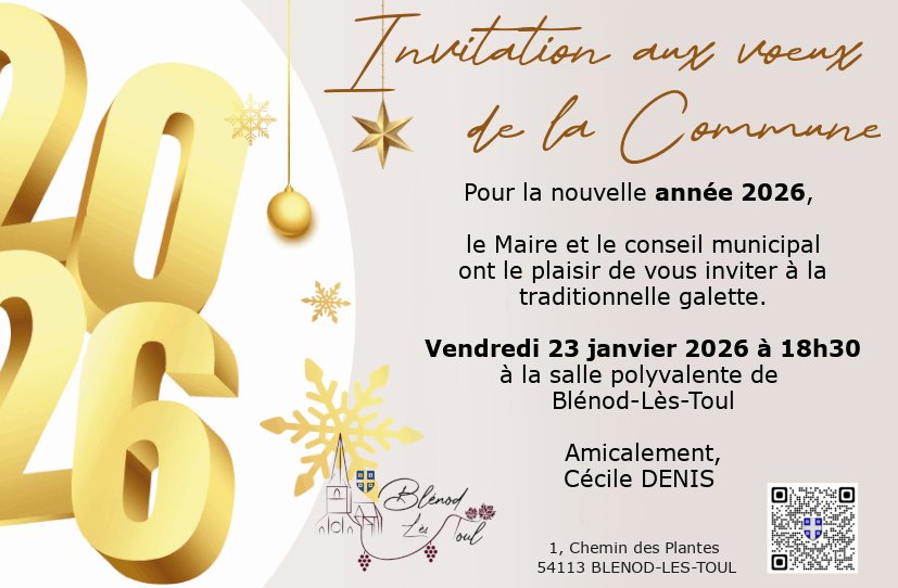 Madame le Maire et l’ensemble du Conseil municipal ont le plaisir de vous inviter à partager un moment convivial à l’occasion des vœux de la Commune. Ce sera l’occasion de se retrouver, d’échanger quelques mots… et de débuter l’année 2026 autour de la traditionnelle galette 🥧✨