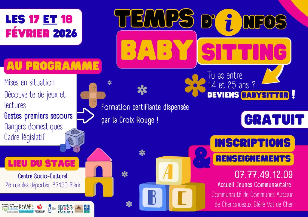 Les 17 et 18 février 2026, un temps d’informations dédié au baby‑sitting est proposé au Centre Socio‑Culturel de Bléré. Cette formation, ouverte aux jeunes de 14 à 25 ans, permet d’acquérir les bases indispensables pour assurer la garde d’enfants en toute sécurité. Dispensé par la Croix‑Rouge, ce stage certifiant aborde différents aspects essentiels : mises en situation, découverte de jeux et d’activités adaptées, gestes de premiers secours, prévention des dangers domestiques et introduction au cadre législatif lié au baby‑sitting.