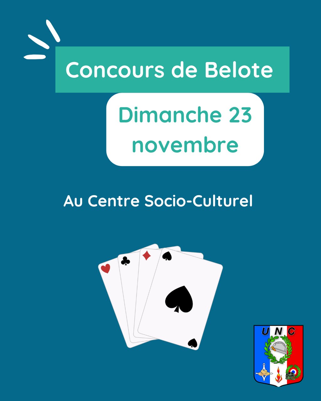 LâUnion Nationale des Combattants vous donne rendez-vous le dimanche 23 novembre au Centre Socio-Culturel (26 rue des DĂ©portĂ©s, 37150 BlĂ©rĂ©) pour un concours de belote individuel sans annonce !