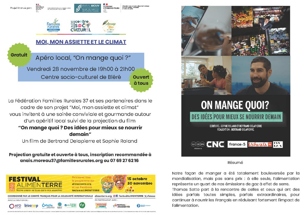 La Fédération Familles Rurales 37 et ses partenaires vous invitent à une soirée conviviale et gourmande autour d’un apéritif local, suivie de la projection du film documentaire